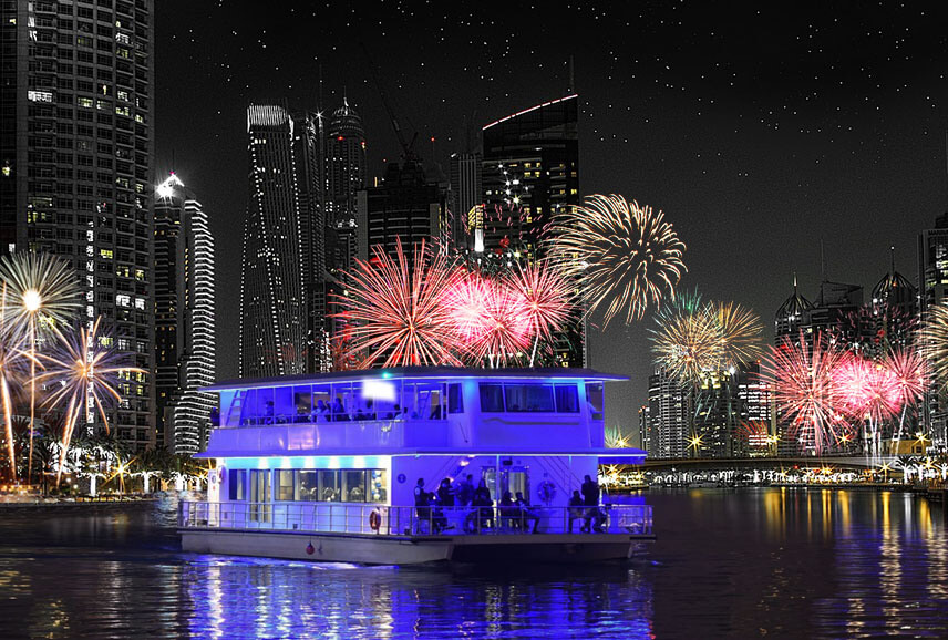Witness Live Fireworks of Dubai Marina, JBR and Atlantis at our Modern New Year’s Eve Dubai Marina Catamaran Cruise.